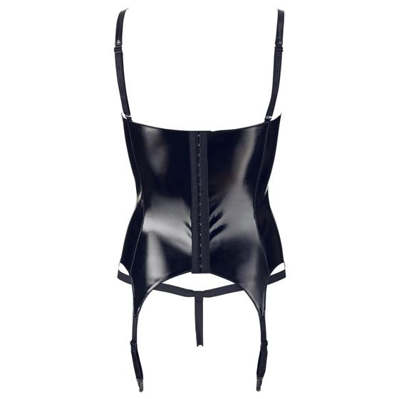 För en perfekt passform har plagget justerbara axelband samt sex strumpebandshållare, så att du kan kombinera det med dina favoritstrumpor. Knäppningen baktill gör det enkelt att ta på och av. Tillverkad av 100% polyester, med polyuretanbeläggning för en intensiv glans. Obs! Strumpor ingår ej.